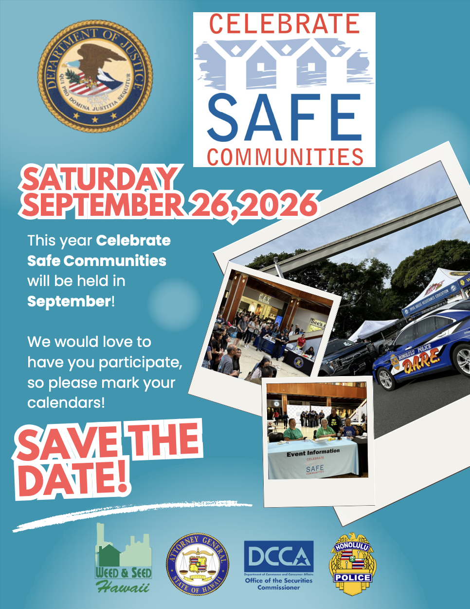 Celebrate Safe Communities @ Pearlridge Center Mauka Saturday, September 26, 2026 10:00 AM 3:00 PM Google Calendar ICS